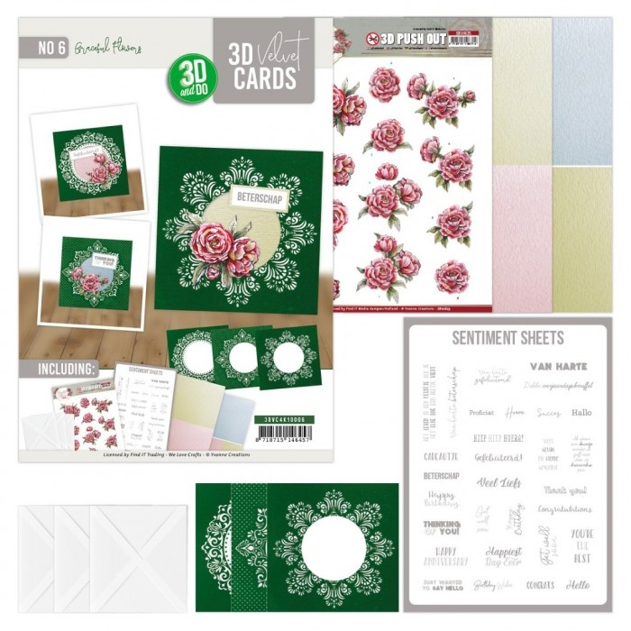 Deze set omvat een push-out vel en een sentiment sheet met hartverwarmende teksten in zowel het Nederlands als Engels. Daarnaast krijg je 3 witte enveloppen, een sfeervol achtergrondpapier en 3 luxe fluwelen kaarten die heerlijk zacht aanvoelen.
