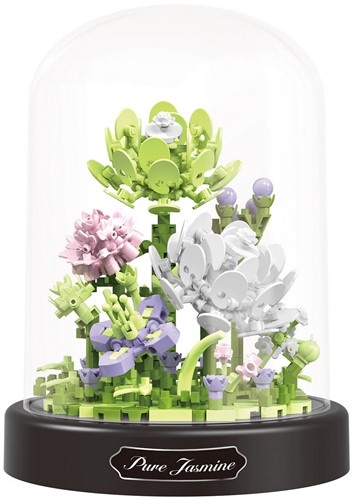 Dit bouwpakket is een prachtige manier om een tijdloos jasmijnboeket te creëren. Het boeket blijft altijd mooi en verwelkt nooit. Plaats de doorzichtige stolp over dit boeket voor een verfijnde, chique uitstraling op de zwarte schotel. Ook ideaal als creatief cadeau-idee.