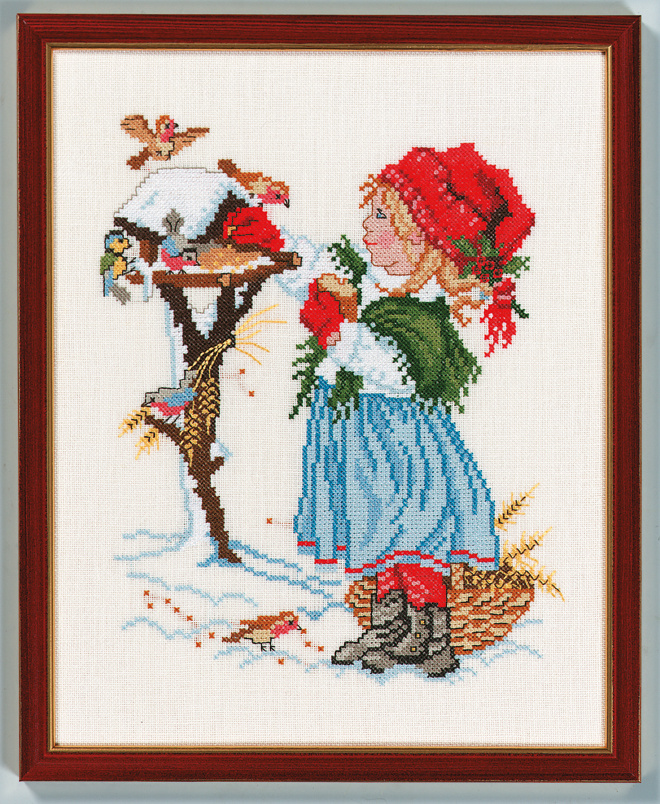 Kruissteek borduurpakket met een meisje die vogeltjes voert