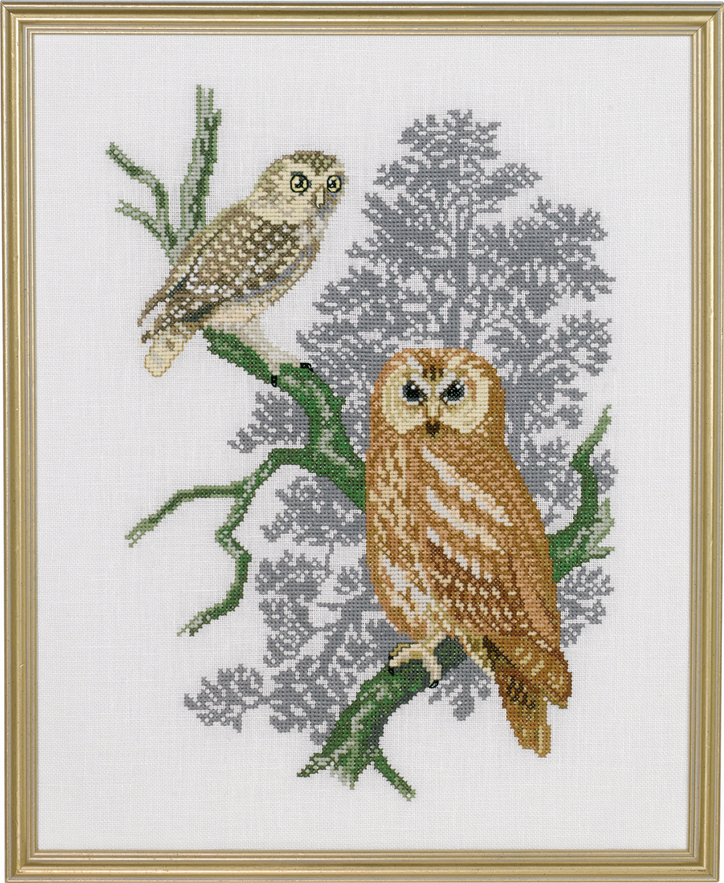 Kruissteek borduurpakket met 2 uilen zittend op een boomtak