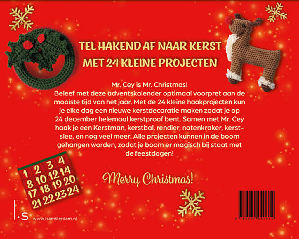 Mr. Cey is Mr. Christmas! En door zijn kerstadventskalender kunt u optimaal voorpret beleven aan de mooiste tijd van het jaar. Met de snel te haken patronen kunt u elke dag een nieuwe kerstdecoratie maken zodat u op 24 december helemaal kerstproof bent. Samen met Mr. Cey haakt u een kerstman, kerstbal, rendier, notenkraker, kerstslee en nog veel meer.