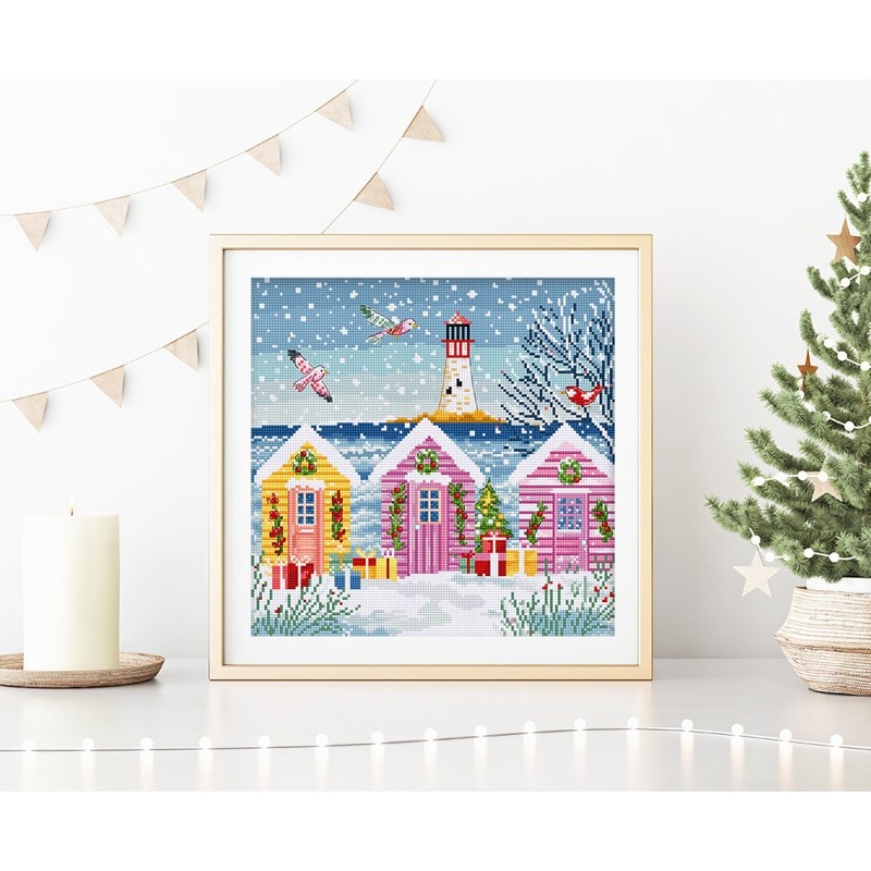 Kruissteek borduurpakket met schattige gekleurde huisjes aan zee in de sneeuw