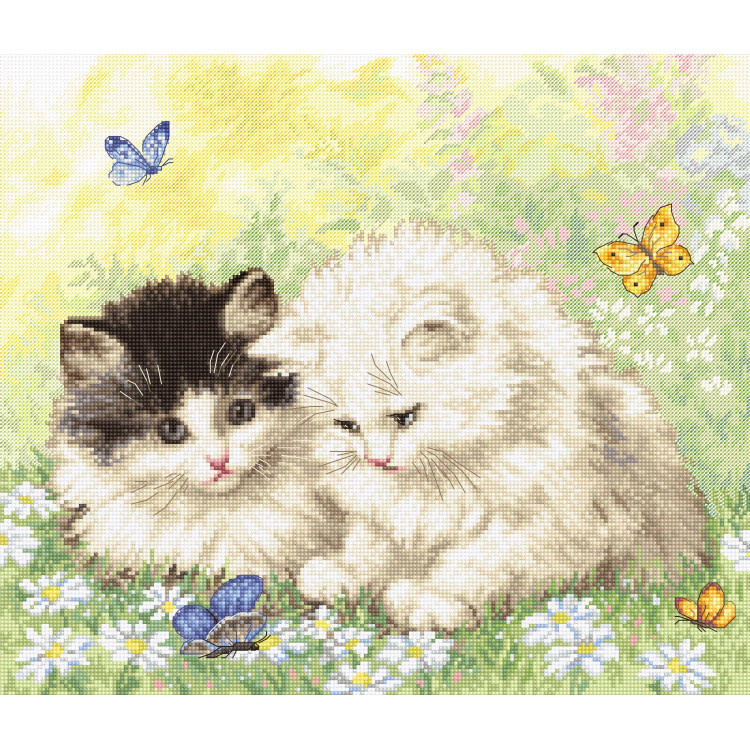 Kruissteek borduurpakket met telpatroon met 2 schattige poesjes liggend in het gras