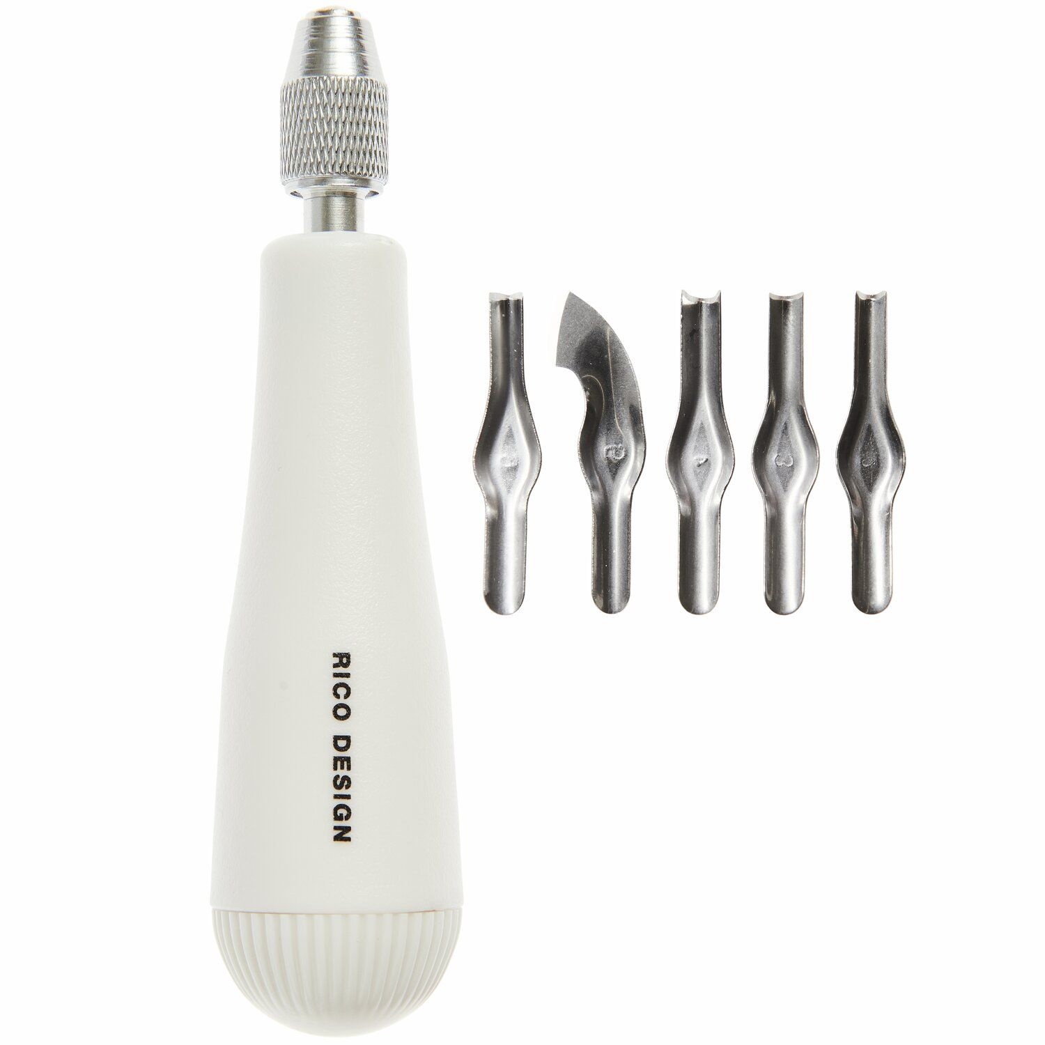 Het linosnijgereedschap heeft een handige kunststof handgreep met geïntegreerde opbergruimte voor de mesjes; een schroefdop zorgt ervoor dat het mesje stevig vastzit. De set bevat vijf mesjes voor verschillende sneden: geitvoet, U-vorm, holijzer 3 mm, holijzer 4 mm en contourmes. Het artikel is geschikt voor rechts- en linkshandigen.