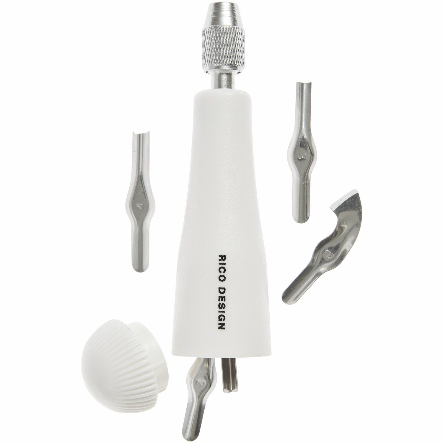 - Inhoud: 1 handgreep en 5 mesjes (bokvoet, U-vorm, holle ijzer 3 mm, holle ijzer 4 mm en 1 contourmes)
