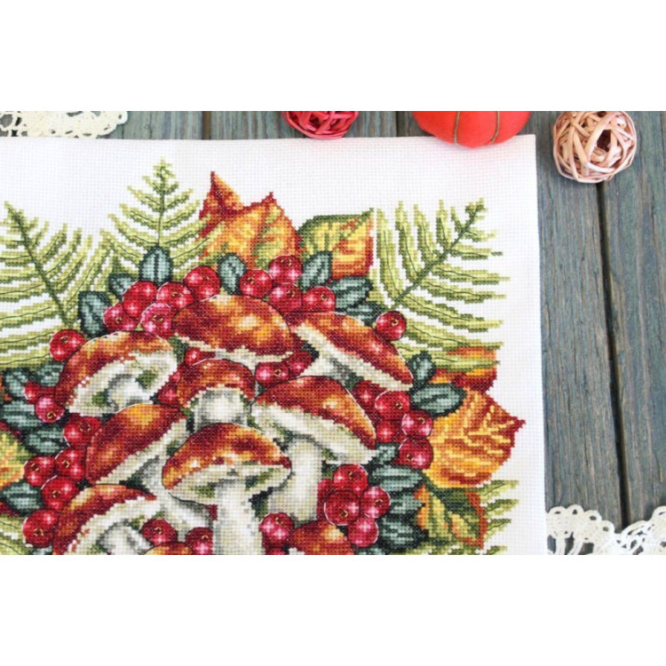 Borduurpakket met de warme kleuren van de herfst, paddenstoelen en rode besjes