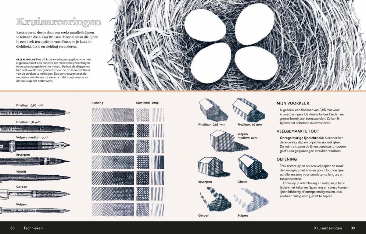 • Ontdek technieken zoals kruisarceringen, pointillisme en krabbels.
