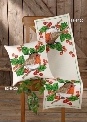 Kruissteekkussen met een roodborstje op een takje met rode bessen