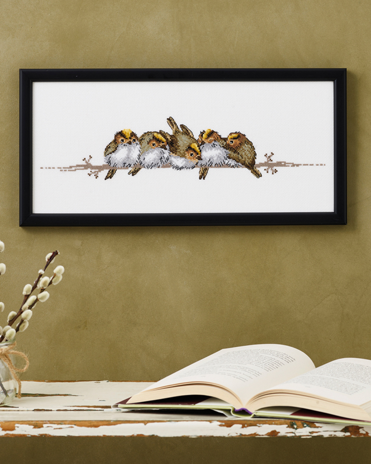 Borduurpakket met 5 schattige vogeltjes zittend samen op een tak