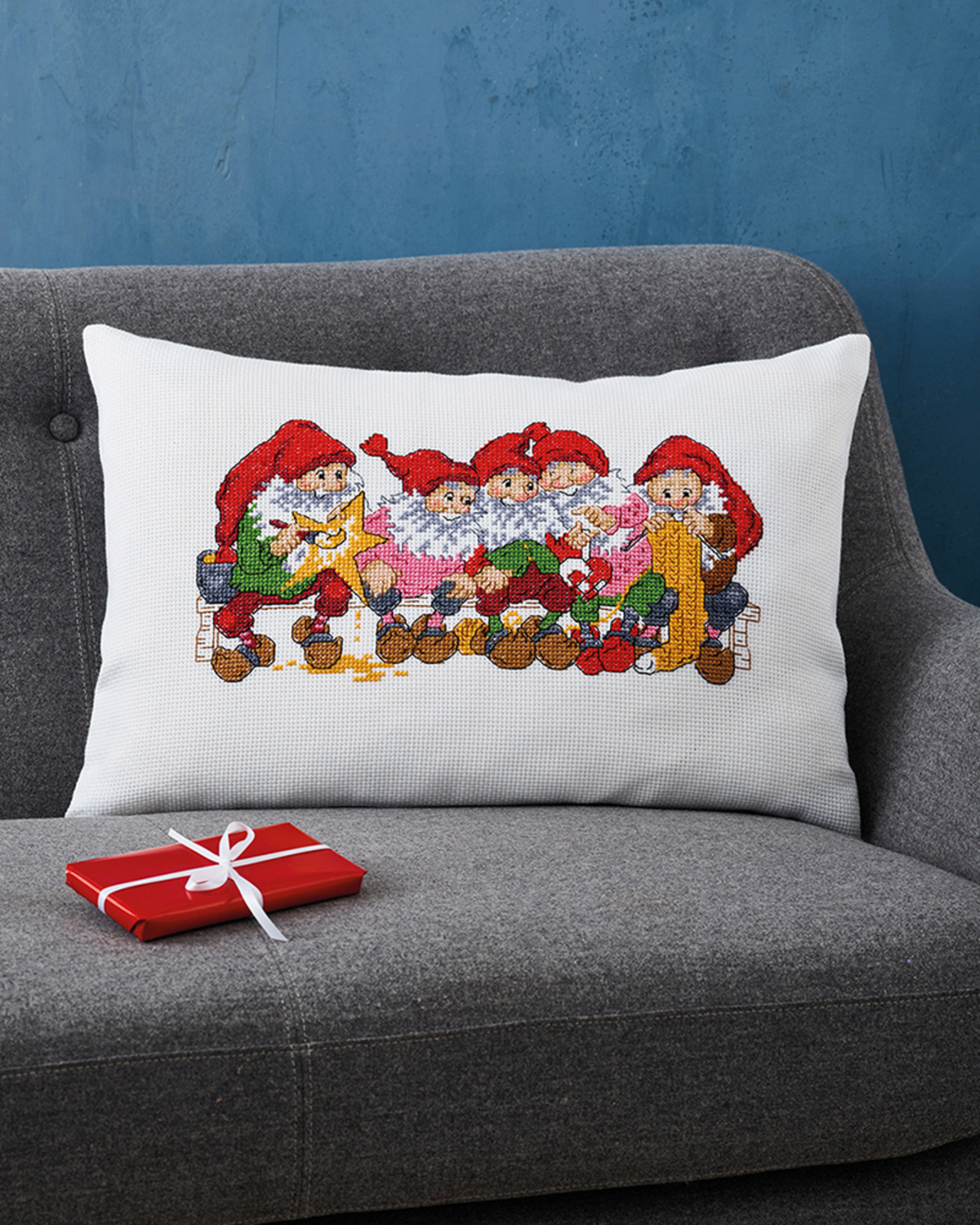Vrolijk kerst borduurkussen met kleine kaboutertjes
