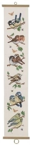 Borduurpakket van het merk Permin voor het borduren van een schellekoord met vogels uit de tuin