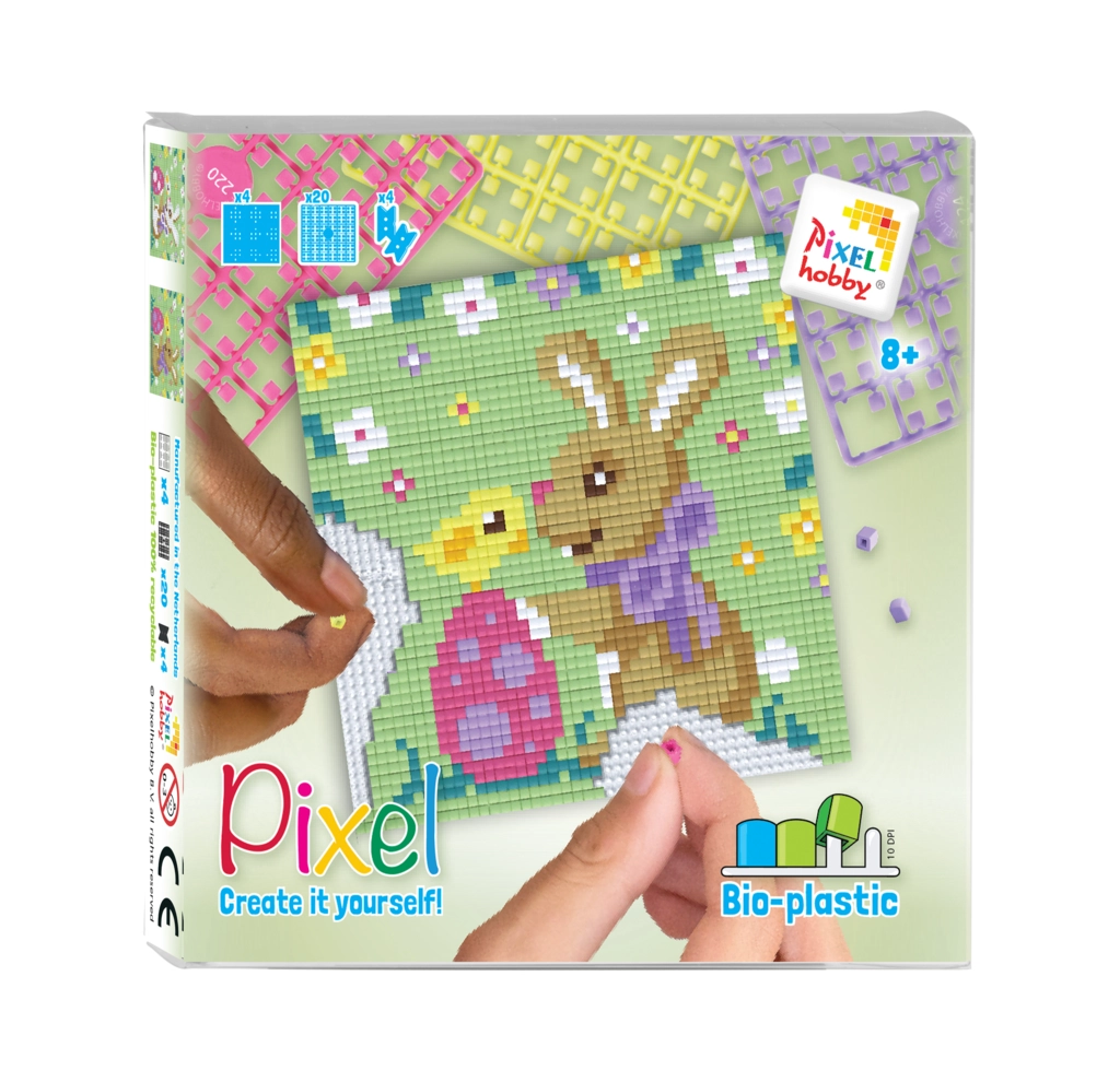 Pixelhobby setje voor kinderen, voor het maken van een Jungle patroon met 4 kleine basisplaatjes die met zwaluwstaatjes aan elkaar gekoppeld worden.