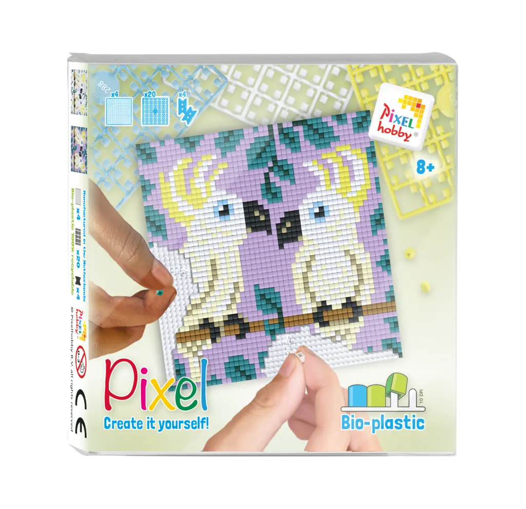 Pixelhobby setje voor kinderen, voor het maken van een Jungle patroon met 4 kleine basisplaatjes die met zwaluwstaatjes aan elkaar gekoppeld worden.
