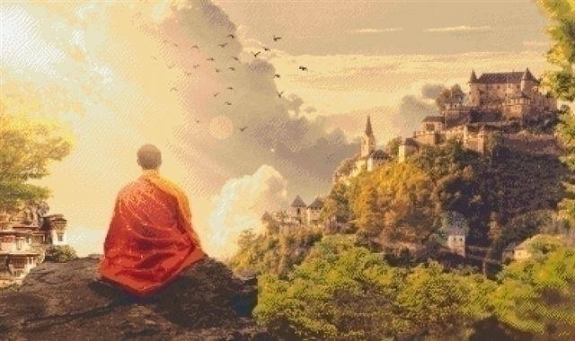 Pixelhobby schilderij van een biddende monnik, dit patroon wordt als compleet pakket geleverd (excl lijst)