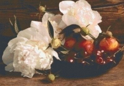 Pixelhobby schilderij met een stilleven met o.a. pioenrozen
