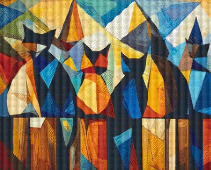 maak met Pixelhobby een schilderij van een een rij poezen zittend op een houten hek in kubistische stijl