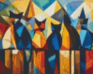 Pixelhobby patroon met 4 basisplaten van een rij katten zitten op een hek in kubistische stijl