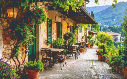 Groot Pixelhobby patroon met 63 basisplaten van een romantisch Italiaans terras in de bergen