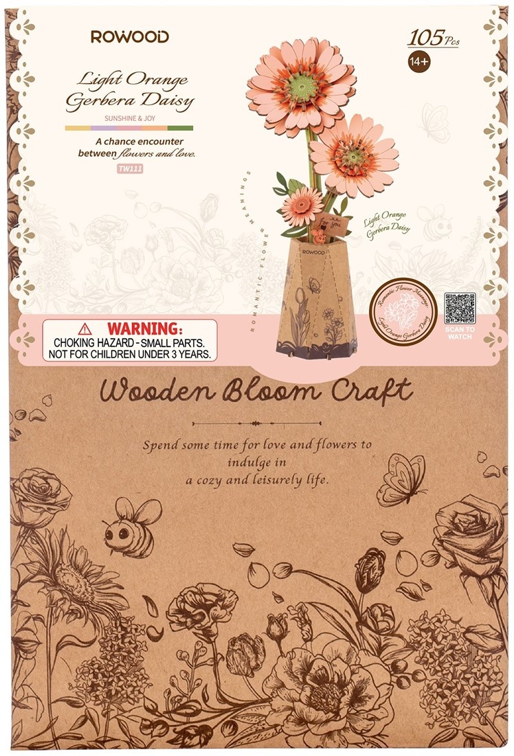 De TW111 van Rowood de lichtoranje gerberabloemen in een vaasje is een houten bouwpakket van Robotime voor volwassen en kinderen vanaf 14 jaar. In een kartonnen vaasje dat de bouwer ook zelf maakt met het bouwpakket staan hoofdzakelijk 3 gerberabloemen in verschillende grootte van een mooie zalmrose kleur. Er zit een bordje bij met For you, waardoor dit bouwpakket graag cadeau wordt gedaan voor of nadat het gemaakt is.