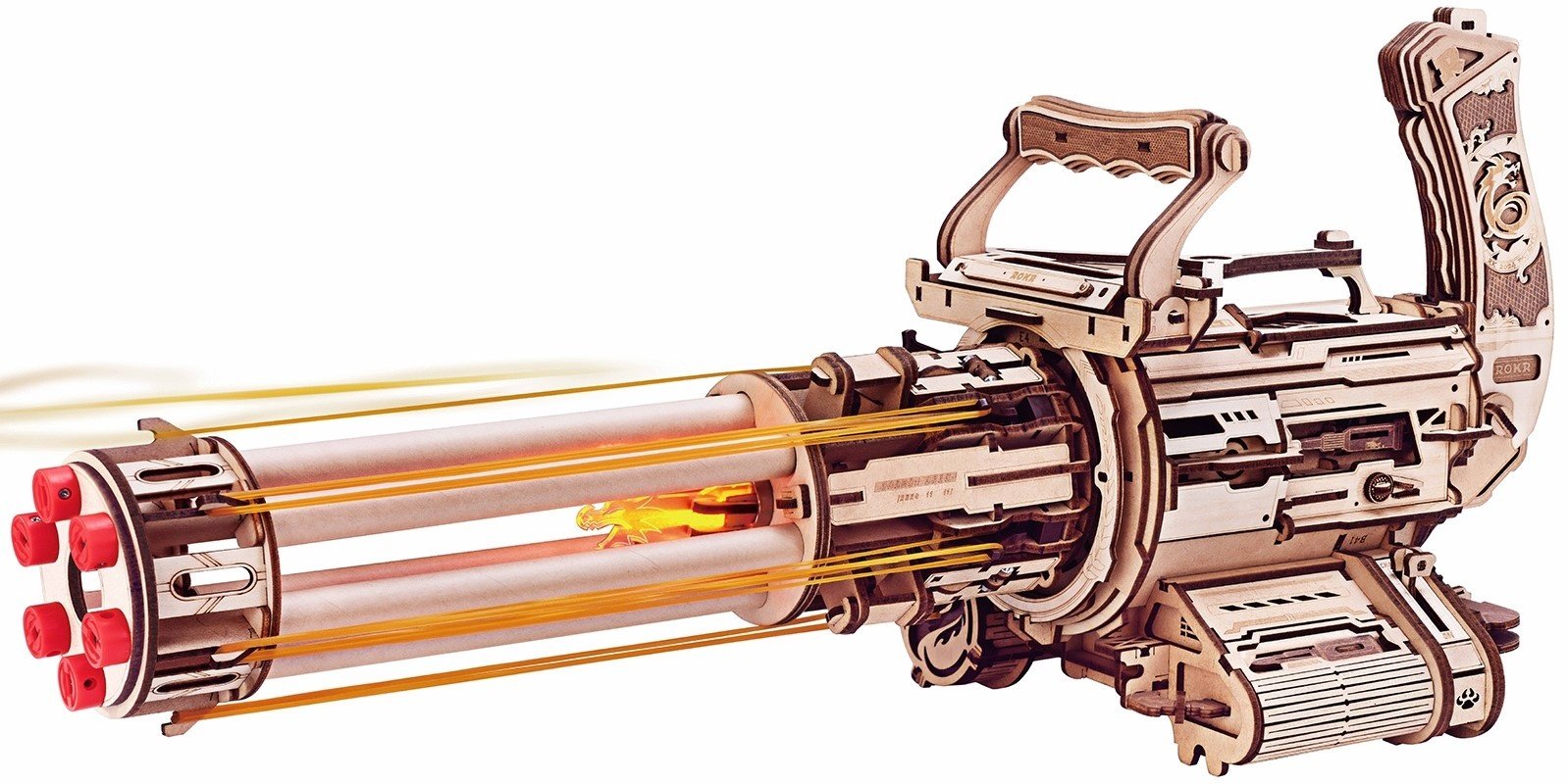 De LQA01 ROKR Rotary machine gun is een houten bouwpakket van een geweer dat kan schieten met elastiekjes. Het geweer ligt stevig in de handen, zes lopen draaien terwijl felrode vuurmonden oplichten. Het zachte klikgeluid van tandwielen mengt zich met het zoevende schot van elastieken.
