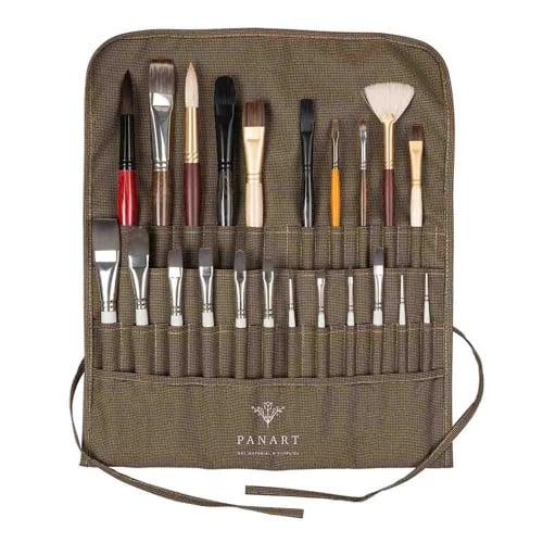 Dit ruime roletui van Pan Art is gemaakt van katoen en polyester en biedt ruimte voor 22 penselen. Het etui is stevig en compact en perfect om mee te nemen onderweg of om je penselen thuis makkelijk te ordenen. In dit etui kunnen je penselen ademen, terwijl ze toch goed beschermd blijven. Het open etui meet 40 x 34 cm en het etui is te sluiten met striklint