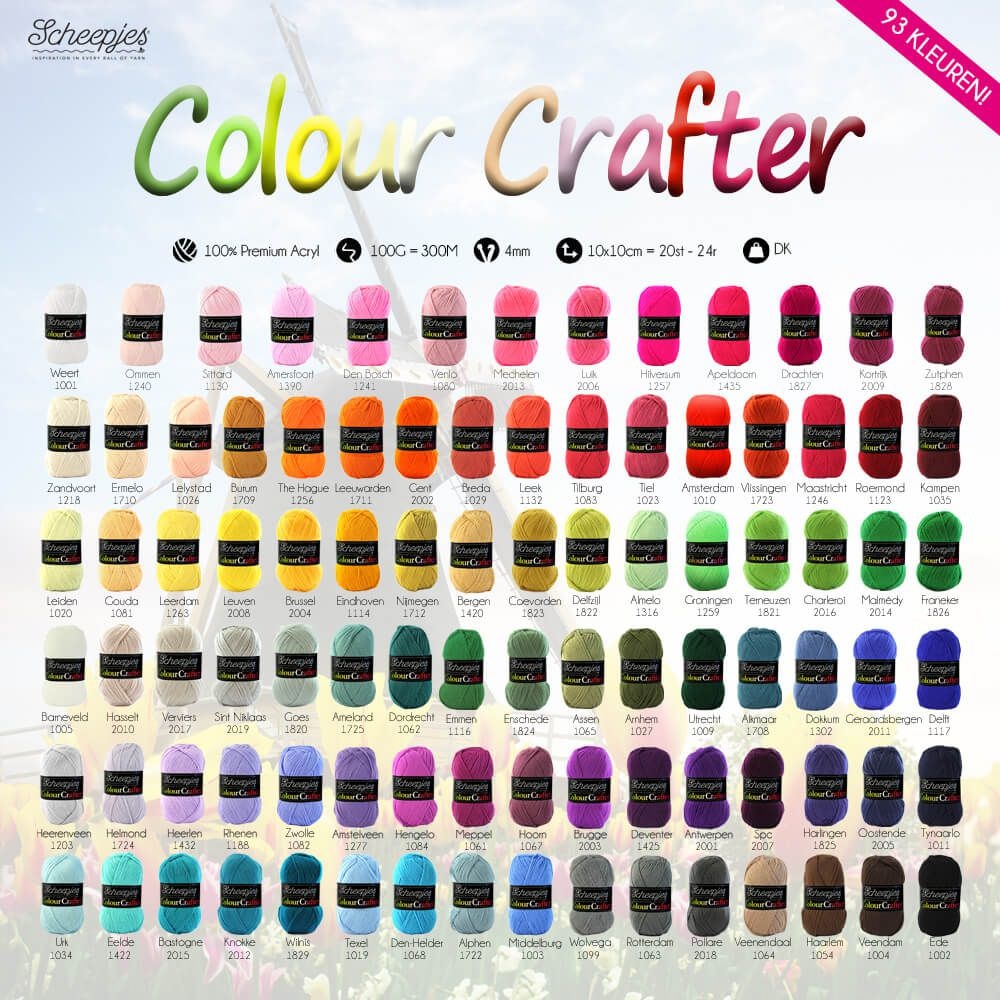 Scheepjes Colour Crafter garen heeft een superieure kwaliteit van 100% premium Acryl met een zijdezachte touch en is verkrijgbaar in maar liefst 93 sprekende kleuren. De extra grote bollen van 100 gram (looplengte 300 m) zijn uitermate geschikt voor het maken van grote home-deco projecten zoals woondekens en kussens. Maar ook voor kleding en voor het haken van amigurumi is het garen zeer geschikt. Wat je ook maakt: het haak- en breiwerk wordt en blijft prachtig! Materiaal: 100% Premium acrylic Pendikte: 4 Garendikte: DK Looplengte: 300 meter Stekenverhouding:20 st x 24 nld is 10 x 10 cm met 4 mm naalden Gewicht: 100 gram
