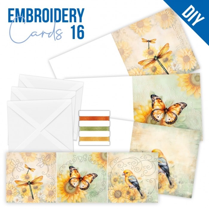 Dit handige borduursetje bevat alle materialen voor drie vierkante kaarten.