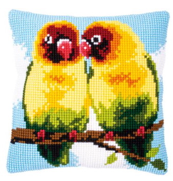 Kruisteek kussen borduurpakket met 2 kleine agapornissen zittend op een tak