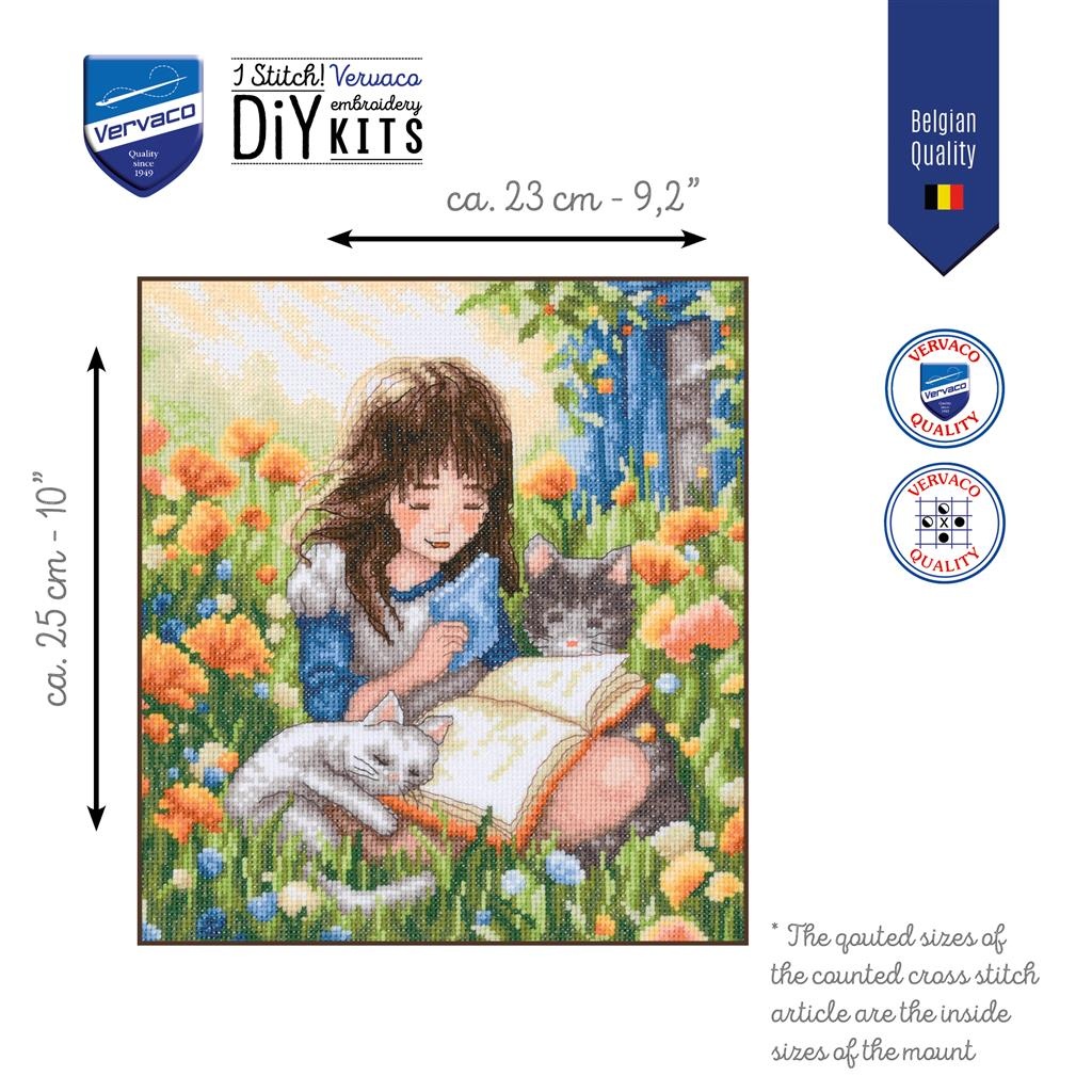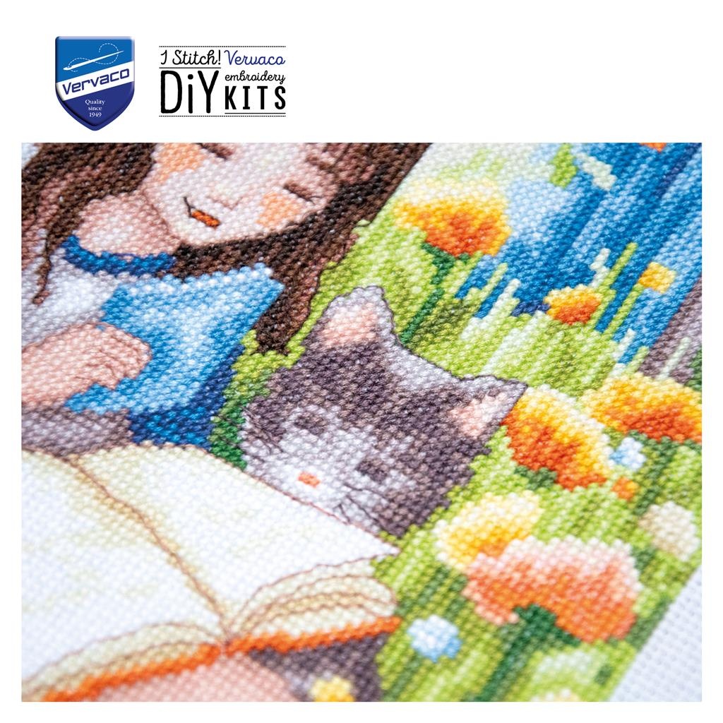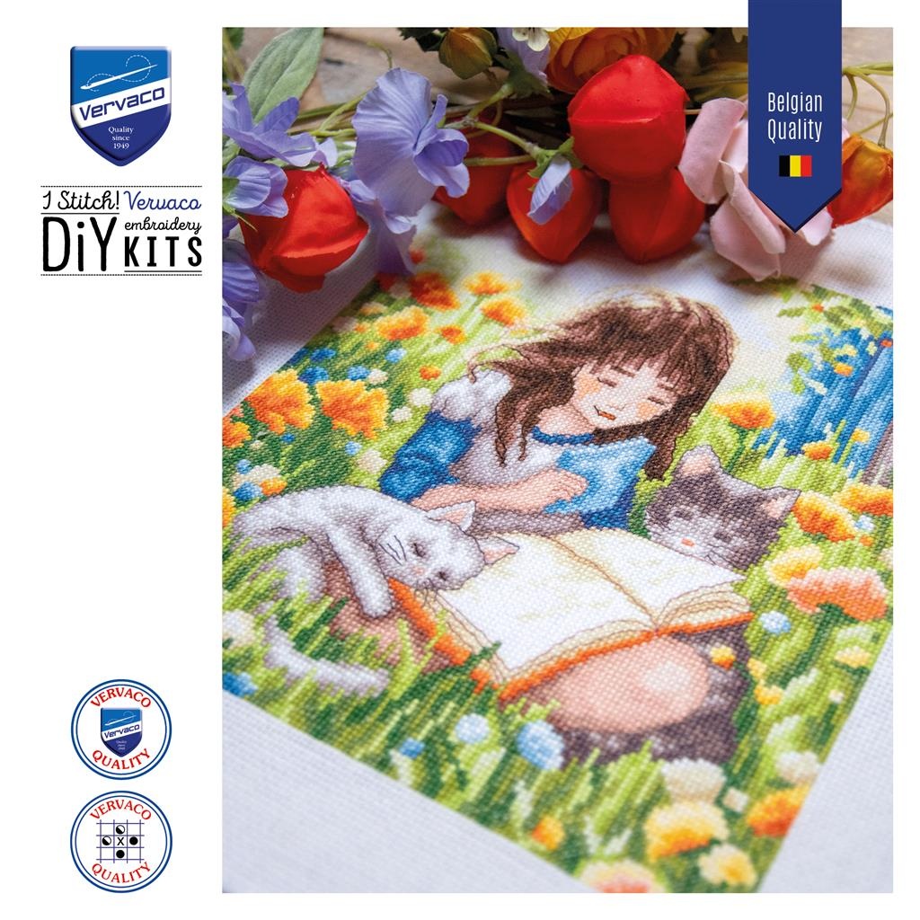 Makkelijk niveau te borduren borduurpakket van Vervaco van een klein meisje lezend in het gras met haar poesjes