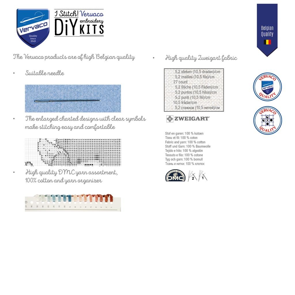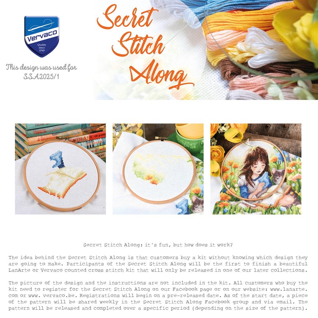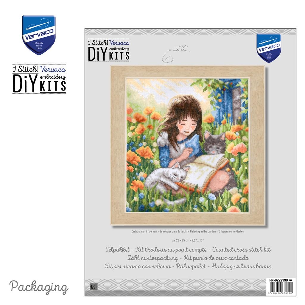 Makkelijk niveau te borduren borduurpakket van Vervaco van een klein meisje lezend in het gras met haar poesjes