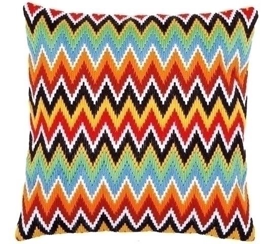 Handwerkkussen pakket voor het borduren met spansteken van dit vrolijke gekleurde kussen.