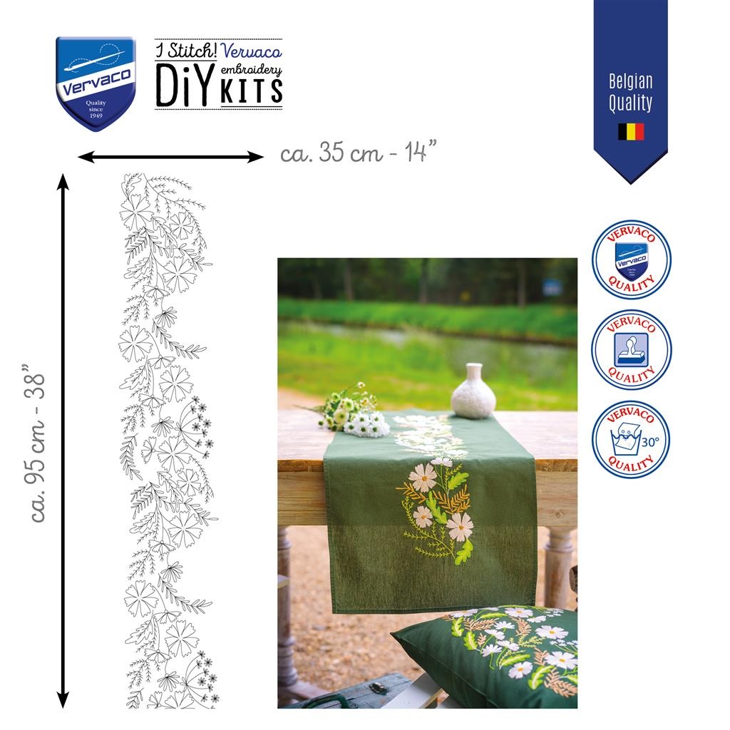 Borduurpakket met een lange smalle tafelloper met bloemen op groene borduurstof